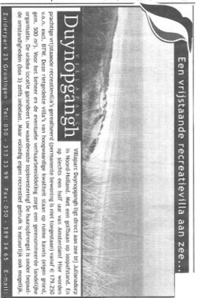 De grootste bedreiging van het Nederlandse landschap wordt gevormd door de recreatie. Te meer daar recreatie niet meer bestaat uit het af en toe bezoeken van een recreatiepark. Men wil er in wonen! Het liefst in een recreatieparc. En dat is heel wat anders dan een park. Wonen in een parc is gezond wonen in een verrassend sfeervol interieur op schitterende landelijke ligging in een fraai bosperceel een toplocatie modern comfort gecombineerd met een stukje nostalgie stoere robuuste bouw met romantische trekjes op loopafstand van de golfclub met eigen aanlegplaats meer rust meer inspiratie een exclusief project van zeldzame allure. Is architect een beschermd beroep? Mogen de lieden die de wanstaltige retrostulpen van de villaparcen schetsen, zich architect noemen? Waar u op moet letten bij de aanschaf van een recreatievilla: staat in de naam van het project een letter verkeerd of teveel, dan bent u 'verkeerd bezig' en betaalt u teveel. Iepenborgh. Waterrijck. Havenstaete. Klap op de vuurpijl: Villaparc Duynopgangh (wordt echt gebouwd, aan zee bij Julianadorp!) Het wachten is op een verdere verslechtering van de economie, zodat de parcen kunnen worden weggebulldozerd.
