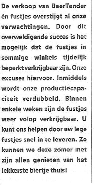 Het is een grof schandaal. Bijna zestig jaar na WO2 en in sommige winkels zijn de fustjes beperkt verkrijgbaar... Gisteren stond ik met mijn lege fustjes in de rij. Geen klein bier: probeer maar 's twee uur te blijven staan met vier lege fustjes op je nek. Velen - ouden van dagen, jonge moeders - gingen dan ook zitten op de fustjes. Waar de fustjes niet op zijn berekend. Ik zag huilende mensen temidden van bezweken fustjes. Kwamen we aan de beurt: 'Nee, meneer, de fustjes zijn op.' Men was nog wel bereid de lege fustjes in te nemen. Je kreeg er een bon voor. Bij inlevering zou statiegeld van de volle fustjes worden afgetrokken. Bevrijdingsdag 2004. De fustjes zijn op de bon.