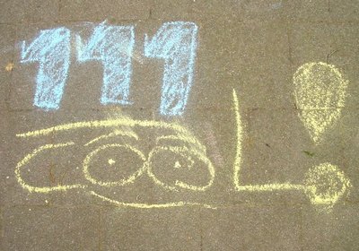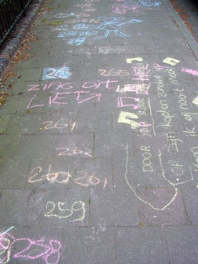 Voor de deur van het redactiegebouw werd gistermiddag een hinkelbaan aangelegd. Omdat ik wilde weten hoe zo'n baan er tegenwoordig uitziet, vroeg ik de jonge wegwerkers of ik een baan mocht meehinkelen. Een uur geleden werd de hinkelbaan door een regenbui helaas gewist.