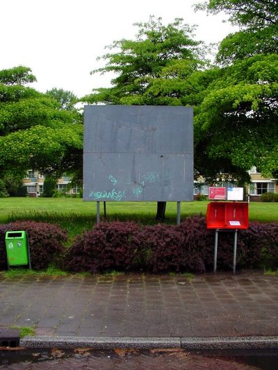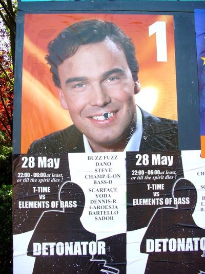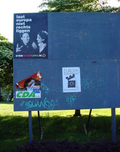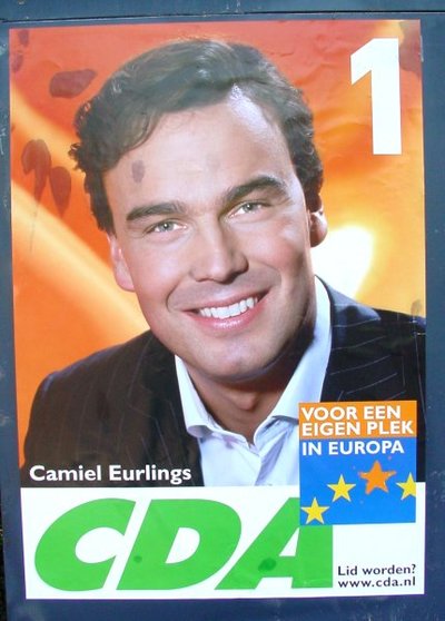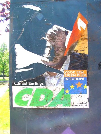 Interesseert niemand zich voor de Europese verkiezingen en dreigt een lagere opkomst dan ooit? De aanplakborden laten een hevige strijd zien. Geen politieke. Het stralende, overambitieuze hoofd van Camiel Eurlings heeft zo'n ergernis opgeroepen, dat niet één CDA-affiche aan de spontane volkswoede ontkomen lijkt. Heftig is er gescheurd en hier en daar zijn er zelfs kluiten aarde (kwakken poep?) tegenaan gesmeten. Voor de duidelijkheid: alle andere affiches wordt geen haar gekrenkt. Is het misschien zo gegaan dat de CDA-verkiezingscommissie bedenkingen had tegen het ego-maniakale affiche, maar dat Camiel zelf eiste dat de campagne uitsluitend rond zijn hoofd zou worden gevoerd? Camiels eerste misser, die het CDA veel stemmen gaat kosten.