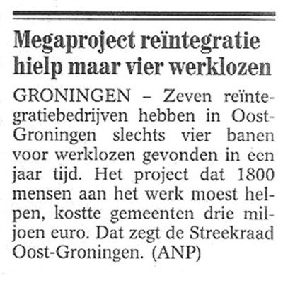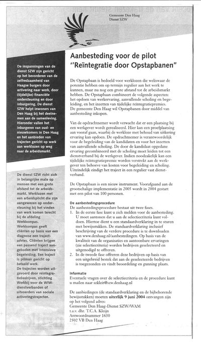 Hard gewerkt vandaag. Heb geprobeerd een advertentie met veel tekst uit de ochtendkrant begrijpend te lezen. 'Aanbesteding voor de pilot 'Reïntegratie door Opstapbanen'' Ik beschouwde het als een goede test voor het meten van mijn denkvermogen. 'Zijn hersenen-op-leeftijd nog in staat deze op het oog ondoordringbare letterbrij te doorgronden'- was de onderliggende vraag bij mijn puzzelwerk. Ik ben eruit; ik meen te begrijpen wat de bedoeling van de advertentie is. Zeer kort door de bocht: De Gemeente Den Haag wil, uit ideëel motief (bevorderen van de zelfredzaamheid), langdurig werklozen aan een vaste baan helpen. Ze heeft daartoe de Opstapbaan bedacht ('een nieuw instrument'). De gemeente zoekt nu middels deze advertentie naar firma's die voor 100 werklozen, bij wijze van proef, een vaste baan gaan vinden (vrije marktwerking). Daar komt heel wat bij kijken. De Opstapbaner (die benaming verzin ik hierbij) dient begeleid en geschoold, er moeten diagnoses van zijn situatie gemaakt, trajectadviezen opgesteld, de werkgever kan een tijdelijke reïntegratiepremie krijgen, er moet ook teruggekoppeld naar de afdeling Werkkompas van de dienst SZW, enzovoorts. Klik de advertentie leesbaar als u het ook eens wilt proberen. Op grond van de kennis die ik mij nu heb eigen gemaakt en aan de hand van persoonlijke instrumenten (de natte vinger en het water), durf ik een resultaat van de pilot van het Opstapbanenproject te voorspellen. Eind 2005 zullen 4 van de 100 werkloze Opstapbaners een vaste baan hebben gevonden. Een operatie die ettelijke miljoenen euro's zal hebben gekost. Ik hoor het commentaar: 'O, wat zijn we weer lekker cynisch. Wat is het toch makkelijk vanaf de zijlijn alles af te kraken.' Mijn antwoord: Ik ben niet cynisch. Mijn voorspelling getuigt van een optimistische visie. De vier mensen die zich in het woordenbombardement en het trajectdoolhof van de Opstapbaan hebben staande gehouden, dienen hogelijk geprezen en van een riant salaris voorzien.