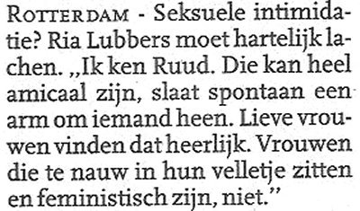 'Seksuele intimidatie' Ben je gek! Ik vond het altijd wel geinig. Maar als ik alle vrouwen zou hebben aangegeven die 'per ongeluk' aan mijn lekkere kontje hebben gezeten, waren veel café's op de fles gegaan, hadden de rechters overwerk gehad en lag het landelijk percentage echtscheidingen stukken hoger.' Mike van der Molen, ex-uitsmijter