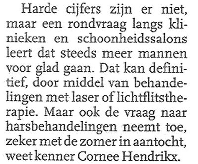 Hier vermoeden we een probleem dat nog bespreekbaar gemaakt moet worden. Mannen die, aangestoken door de gladheidshype, een behandeling Definitief Ontharen hebben ondergaan en daar spijt van krijgen... Prof. dr. Nak de Weert is blij met onze tip. 'O ja? Kan men definitief worden onthaard? Hebt u voor mij het adres van een kliniek of salon waar ik dat kan laten doen?'