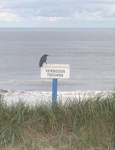 Dit tafereel zag ik vanmorgen. 'Moet vastgelegd,' dacht ik, 'dit beeld betekent iets.' Ik trok een camera en drukte op tijd af, net voor de vogel opvloog. Ik heb gedurende twee uur geprobeerd een begeleidend tekstje te schrijven, maar ik blijk niets zinnigs over dit beeld te kunnen melden. 'Moet ook niet,' denk ik nu, 'waarom altijd dat geïnterpreteer. Ze zeggen toch dat we in een beeldcultuur leven? Laat dat fotootje dan 's voor zichzelf spreken.' Nou, goed dan. Wat hebben de fotografen het toch makkelijk.