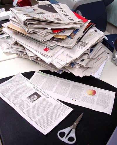 Het karwei is geklaard. Het enorme pak weekendkranten heb ik (nagenoeg) helemaal doorgenomen. Ik ben weer helemaal bij, hoewel ik lichte koppijn heb en scheelzie. Urenlang heb ik me vermaakt en van de binnengehaalde zin en onzin zal allicht iets blijven hangen in de hersenpan. Twee keer heb ik de schaar gebruikt - uit de berg papier zijn twee bewarenswaardige artikelen overgebleven, waarvan ik dacht: die ga ik anderen laten lezen. 1. Een column van Broer Scholtens in de Wetenschapsbijlage van De Volkskrant. Een zeer overtuigend pleidooi voor het eten van appels. Deze column gaat mijn gehele levenswijze overhoop gooien. Ik heb besloten per dag vijf (ongeschilde!) appels te eten, waardoor de kans op kanker en hart- en vaatziekten spectaculair afneemt en ik, volgens plan, 114 jaar zal worden. 2. Moeten we in Irak blijven of maken dat we wegkomen? Veel meningen, weinig informatie. Daarom knipte ik 'De blunder van God', een column van Afshin Ellian uit NRC-Handelsblad. Het laatste deel plaats ik hiernaast. Ik had mijn mening klaar ('zo snel mogelijk weg daar'), maar na het lezen van de column van Ellian weet ik dat ook ik maar wat roep.