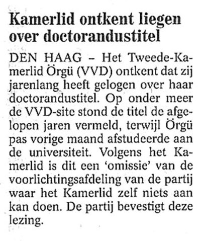 Heeft Tweede-Kamerlid Örgü, mediawoordvoerster van de VVD, jarenlang geprobeerd de ten onrechte vermelde doctorandustitel voor haar naam van de VVD-site te verwijderen? Elke week een email naar de voorlichtingsafdeling? 'Haal die titel nou weg, hier krijg ik gedonder mee...' Telefoontjes, brieven, smeekbeden - niets hielp? Hoewel zij de titel vandaag kennelijk wel mag voeren, is dus uitgekomen dat het Tweede-Kamerlid haar voorstel om de gehele Publieke Omroep op te heffen, niet als doctorandus heeft gedaan. Zij lanceerde haar plan in het wetenschappelijk tijdschrift van de VVD. Omdat men dacht dat de tekst geschreven was door een doctorandus is er hier en daar nog enige aandacht aan geschonken. Welke nieuwsrubriek van de Publieke Omroep zoekt deze zaak tot op de bodem uit? De vele doctorandi die in de afgelopen jaren door de mand vielen, hebben recht op gelijke behandeling. AANVULLING: Twee Vandaag (AVRO) wijdde gisteren een gedegen reportage aan deze zaak.