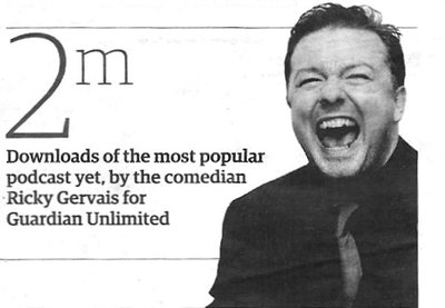 Twee miljoen maal is de podcast van de Ricky Gervais Show momenteel gedownload en het 'radioprogramma' van een halfuur is daarmee de populairste van de duizenden podcasts die overal ter wereld als paddestoelen uit de grond schieten. De 12-delige show van Gervais, waarop men zich gratis kan abonneren, wordt aangeboden door een krant, The Guardian, en volgens mij vormt het succes een aanwijzing hoe kranten met dit nieuwe medium kunnen omgaan. Iets exclusiefs brengen, uitsluitend op internet te bekijken of te beluisteren - het lijkt een betere weg dan het brengen van nieuwsreportages die vaak kwalitatief minder zijn dan wat op de televisie in de journaals al in ruime mate voorhanden is. De podcast van Gervais is nu nog gratis te ontvangen - dat de gebruikers voor een tweede serie zullen moeten betalen ligt voor de hand. Als er van de twee miljoen luisteraars een miljoen overblijven die bereid zijn 1 euro 50 per aflevering te betalen, heeft The Guardian een leuke commerciële activiteit in huis gehaald. Heel anders gaat The New York Times met het verschijnsel podcasting om. De krant heeft veertien podcasts geïnitieerd, die naast dagelijks voorpaginanieuws, o.a. ook wijntips, restaurantbesprekingen en boek- en filmrecensies versturen. Is pod- en vodcasting een hype? Misschien. Voorlopig is het een buitengewoon interessante, nieuwe manier van 'uitzenden'.