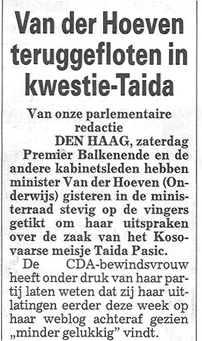 Bravo! Onze regering heeft bewezen adequaat op te treden in noodsituaties. Minister Van der Hoeven had op haar weblog geschreven dat ze 'wel sympathie' had voor de 18-jarige scholiere die in Nederland haar vwo-opleiding wil afmaken. Sympathie voor een buitenlandse... hoe haal je het in je hoofd! Als minister Verdonk over de ballen beschikt die haar worden toegedicht, negeert ze een rechterlijke uitspraak en besluit ze de scholiere alsnog uit te zetten. Als het voltallige kabinet haar daarna hoogstpersoonlijk naar het vliegtuig brengt, wordt een goed signaal afgegeven. Maar nu even in alle ernst. De meest adequate vorm van commentaar heeft minister Hoogervorst ooit voorgedaan: je mond wagenwijd openen en een vinger in je keelgat steken.