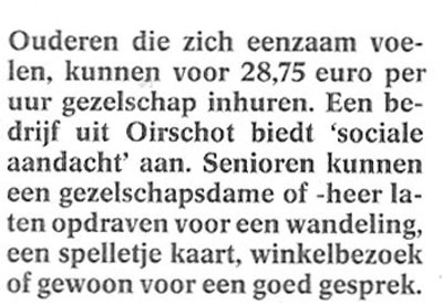 Als de gezelschapsdame of -heer die een uur gaat wandelen met de senior een afgestudeerd bioloog of ornitholoog is die onderweg geanimeerd kan vertellen over de flora en fauna, of als de dame of heer die een spelletje kaart wil komen spelen zich Nederlands kampioen kwartetten mag noemen, of als de senior tijdens het winkelbezoek een geschoolde diëtiste, of modedeskundige meekrijgt, of als het goede gesprek kan worden gevoerd met een gediplomeerd filosoof, dan is 28 euro 75 per uur een bespottelijk laag bedrag.