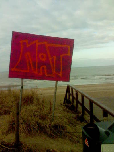 Hoewel ik zelf aarzel, durf ik mij nu af en toe kunstenaar te noemen. Het is even wennen en ik dacht eerst dat je door foto's te nemen met je mobieltje geen kunst kon maken, maar mijn vriend Klaas van der Woude bracht mij op andere gedachten. 'Tuurlijk ben jij kunstenaar,' zei hij toen ik vroeg of ik me kunstenaar mocht noemen, 'en een behoorlijk moderne ook. Jij hebt toch het idee gehad van die hoofdententoonstelling van gemeenteraadskandidaten? Nou, dat is concept-art van de bovenste plank. Die je nog laat uitvoeren door anderen ook! Hartstikke modern-klassiek, zeg maar.' Ja, het loopt heel goed met de tentoonstelling. Er komen nog steeds inzendingen van Biesloglezers binnen - hartstikke bedankt. Als ik er vanavond nog even voor ga zitten komen we in de buurt van de 150 hoofden. Klaas ging vanmiddag uit z'n dak toen ik de slideshow liet zien met een muziekje erbij op. We waren terug van een tocht naar zee, waar Klaas ook kunst heeft gemaakt. Klaas is een voormalige graffitispuiter en dat is nog steeds zijn medium - maar nu als kunstenaar dus. Bovenop het duin stond een bord met alle verboden die op het strand gelden - geen honden, niet kitesurfen enzovoorts. Klaas ging het bord met twee bussen te lijf. Eerst met rood om alle bepalingen weg te halen - 'De zee is de vrijheid, daar is niks verbodens aan!'- en toen spoot'ie met oranje het woord NAT er overheen. 'De zee als het ultieme nat. Zo combineer ik in mijn art het conceptuele met het absurdisme, overgoten met een scheut anarchisme, begrijp je wel?' Ik durfde niet verder vragen, maar ik nam met m'n mobiel een foto van het bord. Is mijn foto van Klaas z'n kunstwerk nou ook kunst, vroeg ik me af? Ik dacht van niet. Maar Klaas zei: 'Jij bent toch kunstenaar? Nou, dan is alles wat jij maakt kunst. Jouw kunstwerk van mijn kunstwerk noemen ze een gesammtkunstwerk, weet je dat? Die foto wordt heel veel waard, moet jij 's opletten.' Driek the Artist