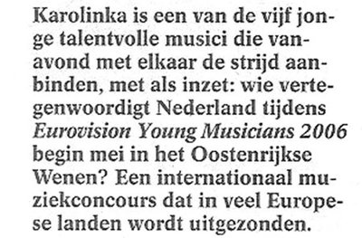 Vanavond op Nederland 1 en Nederland 2 volop Champions Leaguevoetbal en ook op Nederland 2 de Olympische Spelen. Dan mag Nederland 3 niet achterblijven. Vijf jonge musici gaan 'met elkaar de strijd aanbinden' op het onderdeel Mozart. Een klarinettist, een violist, twee pianistes en een harpist knokken om een eerste plaats. De snaren gaan ons om de oren vliegen. Het lijkt vrijwel zeker dat de klarinettiist met zijn slaghout gaat winnen. Ik ga vanavond maar 's een paar cd'tjes draaien. Hè lekker. Even geen opgefokt wedstrijdgedoe aan het hoofd.