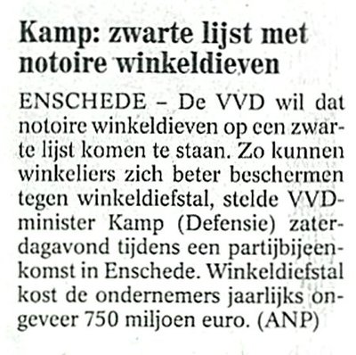 Plaats winkeldieven op een zwarte lijst. Een uitstekend plan van minister van Defensie Kamp. Zo leer je de Afghaanse bevolking wat rechten en plichten zijn in een democratische samenleving. We nemen aan dat onze militairen goed zijn getraind in het opsporen en aanhouden van winkeldieven in Afghaanse winkels. Dat schijnt nog heel moeilijk te zijn - die mensen daar hebben namelijk heel wijde kleren aan en hoofdbedekkingen die gemakkelijke herkenning bemoeilijken.