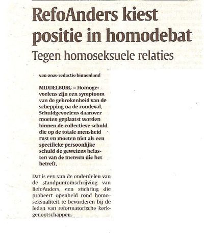 Zoals u wellicht weet, ben ik een grage lezer van het Nederlands Dagblad - 'Christelijk betrokken' - een krant die het Gereformeerde gedachtegoed uitdraagt. Ik vind er artikelen die in geen andere krant worden opgenomen en dat is verfrissend. En begrip voor dat gedachtegoed is nodig, want enkele vertegenwoordigers van de Reformatorischen hebben belangrijke, machtige functies in ons land - ons kabinet telt vijf Gereformeerden. Nu, na maanden het Nederlands Dagblad te hebben gelezen, begin ik iets te begrijpen van de kijk op de wereld door een Gereformeerde bril. Toch knipperde ik vandaag met mijn ogen. Ik ben lang met bijgaand artikel bezig geweest (zie het gehele stuk via de link onderaan). Is dit slecht of goed nieuws voor Gereformeerde homo's? Volgens de Stichting RefoAnders is het niet langer hun eigen schuld dat zij homo zijn - de totale mensheid is schuldig aan de gebrokenheid van de schepping na de zondeval. Goed nieuws dus, toch? Een Gereformeerde homo is uiteraard schuldig, maar de hetero-gereformeerden - en wij allemaal - nemen een deel van die schuld op onze schouders. Meer positiefs zit er niet in, want een homoseksuele relatie wordt nog altijd ten zeerste afgekeurd (lees het artikel). Voor de goede orde: ik veroordeel niemand, ik probeer te begrijpen. Maar misschien is dat te slap en zou ik RefoAnders met krachtige taal moeten bestrijden. Anders ben ik in feite ook een beetje schuldig - aan de benarde, liefdeloze positie waarin Gereformeerde homo's zich nog steeds bevinden.