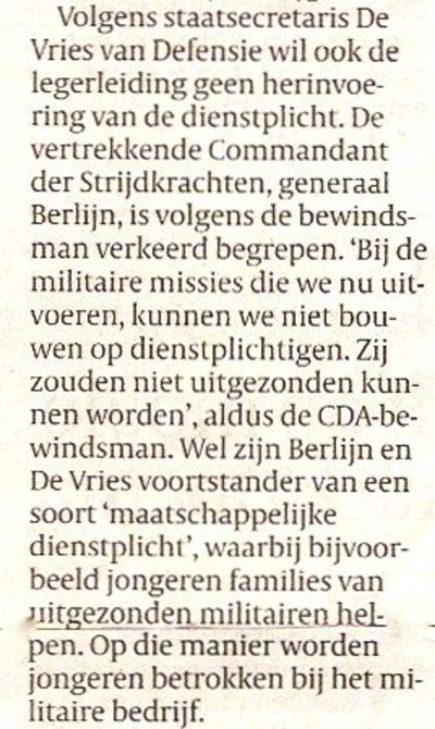 Generaal Dick Berlijn heeft op de valreep van zijn vertrek geroepen dat wat hem betreft de dienstplicht weer mag worden ingevoerd. Een onhandige uitspraak, want in de Tweede Kamer is er geen enkele steun voor het idee; ook zijn eigen militaire achterban ziet er niets in. En ja, dan moet Berlijns baas, staatssecretaris Jack de Vries, de boel rechtbreien. 'De generaal is verkeerd begrepen.' Een van de doorzichtigste spindoctortrucs. Toch is Jack zijn oude vak een beetje aan het verleren. De generaal en hij zijn wel voorstander van een sociale dienstplicht, 'waarbij bijvoorbeeld jongeren families van uitgezonden militairen helpen'. Helpen? Waarmee? Met boodschappen doen? Of krijgen deze dienstplichtigen een opleiding in stressbestrijding en traumahulp? Sorry, Jack, slaat nergens op. Voor Balkenende verzon je wel betere persberichten.