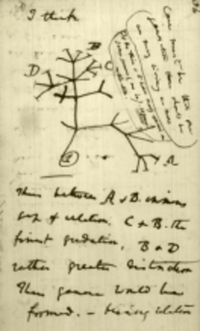 Alles, maar dan ook echt alles wat Charles Darwin ooit heeft genoteerd en bedacht en geschetst en laten drukken - gratis toegankelijk op een site van de Universiteitsbibliotheek van Cambridge. De gehele ontstaansgeschiedenis van de evolutietheorie aan de hand van de aantekeningen die Darwin maakte tijdens de vijf jaar durende reis op het schip The Beagle. Twintigduizend onderwerpen, negentigduizend afbeeldingen. Dit is weer zo'n mammoetinternetproject waar je even ademloos doorheenschiet en denkt: ongelooflijk, maar wie gaat dat allemaal lezen? Wie getroost zich de moeite Darwins moeilijke handschrift te ontcijferen? Wetenschappers dus, die - ik hoorde het kort geleden een paar van hen enthousiast onderstrepen - geen kostbare reizen meer hoeven ondernemen om in een bibliotheek ergens in de wereld een noodzakelijk citaatje te gaan halen. Ik bleef hangen op de eerste druk van The Voyage of the Beagle en ik bleef zeker een uur geboeid lezen. Je liegt! Een halfuur. Nou ja, tien minuten dan. En toen moest ik door naar een andere URL. Van wie moest je door? Van m'n rechterhand die de muis bedient.