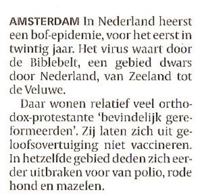 Na het lezen van dit bericht werd ik op slag verlicht en bekeerde ik mij tot Rita en haar TON-beweging. Ja! Weg met die exotische buitenlandse religies en hun enge fanaten! We hebben ze in eigen land! Laten we trots zijn op onze oertraditionele eigen Nederlandse knettergekke gelovigen. Die ons willen besmetten met ziekten die we allang overwonnen hebben. Wij van TON rekenen erop dat onze Rita straks in de Tweede Kamer zal pleiten voor gedwongen inenting.