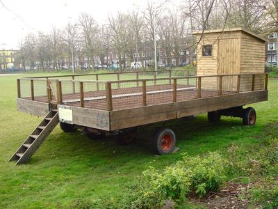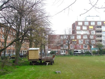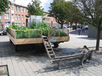 Het is dat ik geen trekhaak aan mijn auto heb. Ik zag mij ook nooit en te nimmer rondrijden met een caravan of boedelbak. Maar nu ik weet heb van de mobiele volkstuin, ben ik van gedachten veranderd. Ik wist dat er in Den Haag één stond en ik vond hem gistermiddag, geparkeerd op een sportveld naast de De la Reyschool. Prachtig idee! Ik zou er graag mee willen toeren. (Ik ga niet nog een keer uitleggen dat mijn opa en mijn vader hun tuinen vele malen hebben moeten ontruimen ten gevolge van oprukkende nieuwbouw.) De mobiele tuin is overal neer te zetten - op saaie pleinen, op niet gevulde parkeerterreinen, tussen kantoorkolossen. En als je wordt weggestuurd, rijd je fluitend weg. De Mobiele Volkstuin - een kunstproject van Annechien Meier bestaat al twee jaar. De tuin ligt (staat) nu in de Transvaalwijk en zal worden verzorgd door schoolkinderen. 'Transvaal ligt dicht bij het centrum van Den Haag. Het is een levendige multi-etnische buurt. Deze wijk wordt ingrijpend geherstructureerd. Veel woningen en tuinen staan op het punt om gesloopt te worden. Ook een door een woonblok omsloten volkstuin aan de De la Reijweg, waar schoolkinderen en bewoners hun groenten kweken, is verdwenen. Nieuwe volkstuinen zijn niet gepland want koopwoningen worden gebouwd en de grond is duur.' Het kunstproject is dus tegelijk een pleidooi voor meer groen in de wijken. Ik kijk nog 's goed naar de voorkant: eh... er zijn dus twee auto's nodig... De twee helften dienen aan elkaar gekoppeld. Mocht ik ooit in aanmerking komen voor een mobiele volkstuin, zou dan iemand met mij mee willen rijden? Iemand die veel verstand van tuinieren heeft, want dat ontbreekt mij.