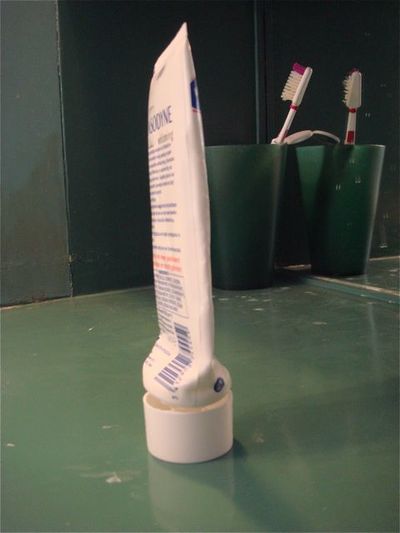 'Wat heb ik gemaakt? Een fotokunstwerk? Een bewegingsexperiment? Een wetenschappelijke uitvinding? Je kent het verschijnsel: je tube tandpasta is bijna leeg. Je knijpt er het laatste sliertje uit, dat nauwelijks de borstel bedekt. Je zet de krom geknepen tube terug op z'n dop (een tube neerleggen, doe je niet meer) en ziet: langzaam zuigt de tube een beetje lucht in en verheft zich helemaal in z'n dooie eentje op zijn dop, tot een kaarsrechte stand. Fascinerend, toch? Ik besloot deze movement te fotograferen, voorbijgaand aan het eventuele verwijt van joh, Dries, krijg jij alleen je tube tandpasta nog omhoog? Ha ha ha ha. Dat vind ik zo goedkoop. Een tube tandpasta is voor mij toch echt geen fallussymbool. Een tandenborstel an sich misschien nog wel, maar een leeggeknepen tube, nee, sorry hoor... Later dacht ik: ja, wacht even, wat gebeurt hier? De tube richt zichzelf op, waarbij energie vrijkomt. Misschien is dit wel de ontdekking van de 21e eeuw - the Self Filling Tube, of zoiets. Dus dat er over tien jaar rijen met grote lege tubes staan opgesteld langs de dijken, die om de zoveel uur gebogen worden, waarna ze zich oprichten; met de vrijgekomen energie van honderd tubes kan een stad als Gouda worden voorzien van stroom. Met mijn foto's ga ik eerst langs een Fotokunstgalerie en daarna door naar TNO in Delft.' Driek de Photo/Art-Freak & Inventor