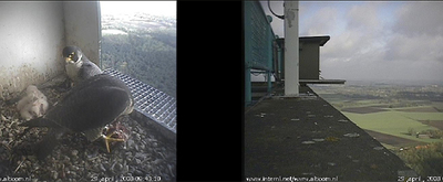 Zijn er dit jaar geen broedende slechtvalken te zien? We missen ze! Een vraag in de mail. Ach jeetje, helemaal vergeten. Op die 127 meter hoge toren zit wel degelijk een slechtvalkgezinnetje met vier jonkies. De beelden zijn niet streamend, maar om de tien seconden is er een nieuw plaatje.