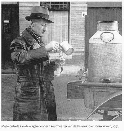 Nee, daar keek ik dus niet van op, toen ik ook vanmiddag in een boekhandel de rijk geïllustreerde 'Geschiedenis van de zuivelindustrie in de Haagse regio' vond, met alle informatie over begin en einde van de melkinrichtingen van De Sierkan. Met daarin dit schitterende portret van een melkkeurmeester, uit de tijd toen de melk nog 'los' aan de deur werd verkocht. Die leren jas, die shawl, die hoed, dat uitgestreken contrôlehoofd... volmaakt! - Ja, melkman, ik heb hier een officiële fles van onze Keuringsdienst met de precieze inhoud van een halve liter en wat zien we als we met uw schenkkan van zogenaamd een halve liter de melk in de fles gieten?