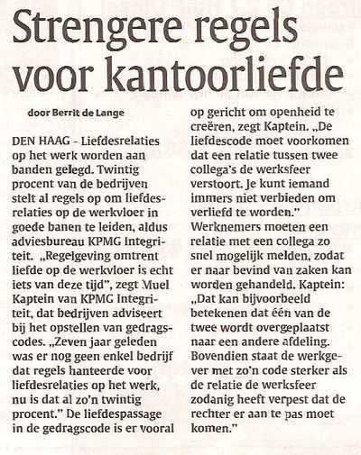- Daar doe jij heel goed aan, Van Dittem. Want liefde op de werkvloer kunnen we natuurlijk niet hebben. Dat gesmiespel en geklesseklef komt het werk niet ten goede.
