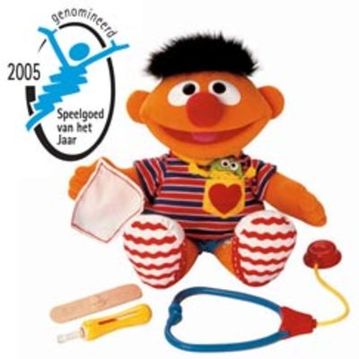 Ernie gaat naar de dokter voor een onderzoek! Er is een stethoscoop waarmee je zijn hartslag kan horen, een zakdoekje waarmee je zijn neus snuit, en een verbandje voor zijn voet. Wanneer je in zijn hand knijpt, legt hij je uit waar hij zich niet zo lekker voelt, en jij kan hem helpen om beter te worden. Als hij helemaal in orde is, zingt hij een liedje over zijn gezondheid. Maar wat is dat nu? Ernie zingt geen liedje. Want Ernie is misschien toch nog niet helemaal beter. Wanneer je in een been knijpt, legt hij uit dat hij door de Chinezen is gemaakt. Voor heel weinig centjes. En de Chinese meneren en mevrouwen hebben lood op hem gesmeerd en dat is helemaal niet goed. Dus moet je Ernie maar niet in je mond steken. Want dan ga jij je ook niet lekker voelen. En dat kan toch niet: een dokter die zelf niet lekker is? Weet je wat? We gooien Ernie weg. Zo. Huppetee de vuilnisbak in. Dag vieze vieze Ernie!