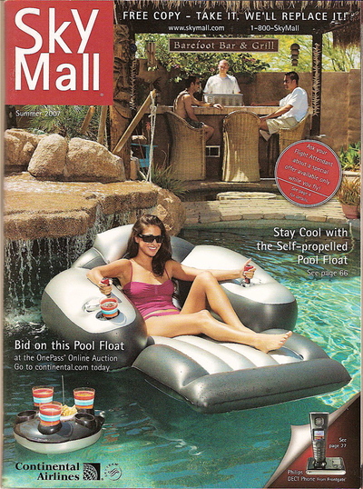 'Een vriend bracht een tijdschrift voor me mee uit de VS. Stampvol zeer Amerikaanse gadgets: van videobrillen, tot spionage-apparatuur en hefschroefwekkers (als'ie afgaat vliegt er een propeller door je slaapkamer en als je die te pakken hebt gekregen, ben je goed wakker). Smullen dus. Bij zo'n cover alleen al kan ik een gat in de dag dromen. Jullie zien mijn vrouw in ons zwembad drijven en kijk 's (als het lukt) naar haar handen - ze omvatten twee joysticks waarmee ze haar bed door de vijver kan sturen! En let 's linksonder op dat plateautje met drankjes en een sandwich. Dat navigeer ik namelijk radiografisch naar haar toe. Bovenin zit ik, in het midden, achter de apparatuur, gezellig in het zitje van onze enorme tuin, met de twee zoons uit haar eerste huwelijk (kan niet? in een dagdroom wel). Maar ja. Dit alles is nog lang geen werkelijkheid. Had ik die Self-propelled Pool Float maar zelf moeten uitvinden en succesvol op de markt zetten. (In mijn droom kreeg ik net een order door uit Dubai voor drieduizend van die waterbedden.)' Driek de Gadgetfreak, dagdromer