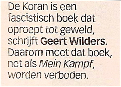 Geert Wilders geeft in zijn stuk op de Forumpagina van de Volkskrant zelf aan waar hij al zijn ideeën vandaan heeft: uit het boek The Force of Reason (2004) van de in 2006 overleden controversiële schrijfster Oriana Fallaci. We kunnen dus beter dat boek lezen dan de kromme samenvatting van Wilders ('Genoeg is genoeg.') Maar ook de kritische commentaren op Fallaci's boek, bijvoorbeeld het gedegen stuk in Asharq Alasat, de Arabische internationale krant, dat aantoont hoe losjes Fallaci met de feiten omging. (Een kleinigheid: 'She blames Muslims for the murder of Dutch politician Wim Fortuyn, who was, in fact, killed by a Christian Dutchman, not a Muslim.')