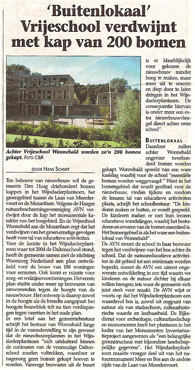 Toen ik in Den Haag Centraal ('Een échte Haagse krant') las dat het plan bestaat in het Wijndaelerplantsoen tweehonderd bomen te kappen, dacht ik eerst: 'Jammer, maar niks aan te doen. Laat maar, je kunt je niet overal druk over maken.' Tot ik vannacht om kwart voor drie boos wakker schoot en in de volgende tirade losbarstte: 'Wacht even! Bomen kappen? Maar dat zijn wel MIJN BOMEN. En ik weet van niks! Wie heeft het sein gegeven dat die bomen wel weg kunnen? Komt niets van in. Hier wordt niet één boom gekapt, is dat goed begrepen! Ik heb als jongen heel vaak tussen die bomen gespeeld. Het Wijndaelerplantsoen? Onzin! Meer en Bos, zul je bedoelen. Daar hebben ze in de jaren dertig de Laan van Meerdervoort doorheen getrokken, maar er bleven twee prachtige helften natuurgebied over. De rechterhelft is een beschermd monument, in het linker deel lag vroeger een grote zandvlakte, omzoomd met bomen en daar hebben we vuren gestookt en hutten gebouwd. Daarna ging er veel verloren door de bouw van scholen - niks tegen scholen - maar als er nu nog een stuk van die oorspronkelijke duinnatuur over is, dan gaan we daar niet in kappen. Geen sprake van!' (Een verontruste lezer zit waarschijnlijk met de vraag in de maag of de hoofdredacteur echt midden in de nacht in tirades losbarst. Nee, niet hardop, het getier speelt zich in zijn hoofd af.) Vandaag ben ik het bos gaan verkennen en het is niet groot, maar wel een mooi stukje oorspronkelijke begroeiing. En als er actie gevoerd gaat worden tot behoud van die tweehonderd bomen, wil ik meedoen door enig publicitair kabaal te veroorzaken. Mijn eventuele medewerking stoelt op nog een argument. Ik vind dat zelf een eng kantje hebben, zeg ik er eerlijk bij. Mijn vader ligt daar namelijk vlakbij begraven (op Ockenburg) en Meer en Bos vormde levenslang zijn speel-, wandel-, en tuinterrein. Als ik dus zou gaan protesteren tegen de kap van die oude bomen, doe ik dat ook uit zijn naam. Die bomen hebben mijn vader nog gekend. Nee, moet ik maar vergeten. Beetje ranzig argument. Beter: we gaan in de Randstad de paar oude bomen die er nu nog over zijn absoluut niet kappen. (Voor degelijker argumenten om tot actie over te gaan, verwijs ik naar het artikel in Den Haag Centraal.)