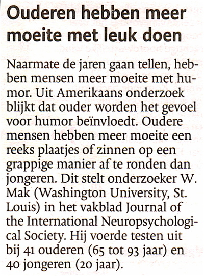 - Ja ja. Meneer De Weert, een collega van u, onderzoeker W. Mak, heeft...'Ja, die ken ik. Wingyun Mak is haar volledige naam. Ja, Wingetje is een leuk dingetje. 'Ouderen hebben moeite met leuk doen'. Ha ha ha. Je moet maar durven. Terwijl ik al vijf jaar geleden een onderzoek naar de humor van 75-plussers heb gepubliceerd in het blad Neuropsychologica.'