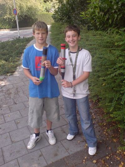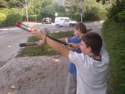 Toen ik tien stappen van de hoek was verwijderd, hielden de jongens op met schieten. 'Wat moet ik doen als ik een bes in mijn nek krijg?', vroeg de meneer Foppe in mij zich even angstig af. Maar de jongens hadden geen boze plannen - ik passeerde en zij hernamen het schietwerk met de eikels, die daar overvloedig op de stoep lagen. Nu werd de Bieslogreporter in mij wakker. 'Mag ik 's even kijken, waarmee wij hier bezig zijn?' Ik trok mijn mobiele camera en verklaarde: 'Dit is voor internet.' Nou, toen wilden ze wat graag met me praten! 'Komen we op internet, meneer?' 'De meeste jongens uit onze wijk schieten hiermee', legden ze uit. 'Het is een stuk buis en aan één uitgang hebben we met tape een ballonnetje bevestigd. Je laat de bes of eikel in de pijp zakken, tot in het ballonnetje, je grijpt net even voor de 'kogel' het ballonnetje met duim en wijsvinger vast, trekt het zo ver mogelijk naar achteren en je laat los.' Stomverbaasd staarde ik de eikel na die ter demonstratie voor mij werd afgeschoten. Zo! Hoog over een boom van vijftig meter! Het is een tijdje terug dat ik voor het laatst een bes heb afgevuurd - er is veel gebeurd in de herfstwapenindustrie. Deze moderne ballonmortier - een kruising tussen blaasroer en katapult - is een wonder van technisch vernuft. Ik bedankte de jongens voor hun medewerking en vervolgde mijn tocht. Later kreeg ik spijt dat ik niet had gevraagd ook een keer te mogen schieten. Mij Oom Wim laten noemen en met ze afspreken zaterdagmiddag op het landje te gaan schieten, leek me een stap te ver.