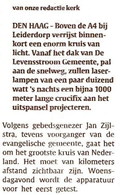 'Als het Zijlstra lukt met dat laserkruis van een kilometer lengte, wordt het lachen geblazen. Ik heb kennissen die een laserkanon hebben ontworpen met een bereik van twee kilometer en die staan te popelen geinige dingen te gaan doen boven de A4 bij Leiderdorp. Bijvoorbeeld: een vierkant van dat kruis maken, laten rondtollen, in sterretjes uit elkaar laten spatten, er een kilometerlange Jezus af laten vallen, enzovoorts, enzovoorts. Maar eerst zal er nog wel een gebedsdienst voor Jan Zijlstra zelf worden gehouden, om hem te genezen van zijn grootheidswanen.' Driek de Gadgetfreak, zelf niet gelovig