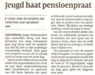 - Jongeren zitten liever aan een kerstdiner met de schoonouders dan dat ze praten over het pensioen 'Dit onderzoeksbureau heeft dus de pensioenvoorlichting op een lijst met 'erge dingen' geplaatst en de respondenten laten kiezen. In opdracht van een grote bank, die met deze 'studie', zoals het wordt genoemd, een campagne gaat beginnen. 'Bij ons is je pensioengaatje gauw gevuld!'. Of zoiets.'
