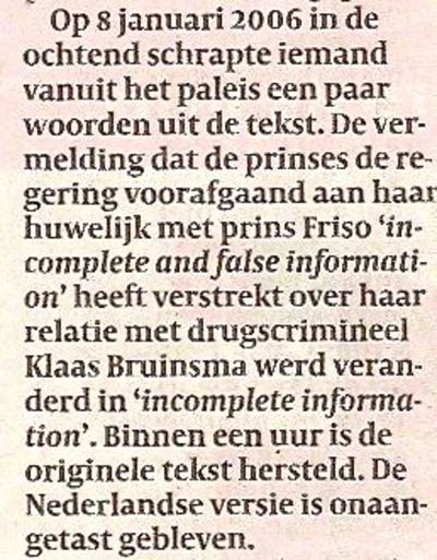 De zinsnede 'incomplete and false information' is dus gedurende één uur in de ochtend van 8 januari 2006 op internet in de Wikipedia incomplete geweest? En Mabel en Friso hebben daarna zelf de tekst weer compleet gemaakt? Dan is deze gebeurtenis, met de forse aandacht van alle media, alsnog uitgegroeid tot de grootste komkommer van deze zomer. Ik heb ook een lemma gekregen in Wikipedia. Goed, hè? Vanmorgen ga ik in die tekst vermelden dat ik 'word gerekend tot de aantrekkelijkste en meest wijze mannen die Nederland ooit heeft gekend'. Naar die tekst ga ik dan een uurtje zitten kijken om hem daarna weer te schrappen.