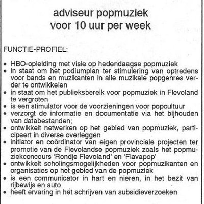 Elke zaterdag neem ik honderden personeelsadvertenties in de landelijke dagbladen door, op zoek naar een passende baan. Nooit zend ik een sollicitatie in. Ik weet heel goed dat ik alleen al op grond van mijn leeftijd nergens meer aan de bak zou komen. Maar fantaseren over verandering, voorkomt geestelijke roestvorming. Vanmorgen vond ik een advertentie waar ik misschien serieus werk van ga maken. Dat lijkt me wat: als adviseur popmuziek de Flevolandse popmuziek initiëren, coördineren en promoten. Ik acht mij daar uitermate geschikt voor. Heb ik een visie op hedendaagse popmuziek? Nou en of. (Test: wie staat deze week nummer 1 in de Wanadoo Top 40? Eminem met Lose yourself.) Bovendien was ik getuige van grote gebeurtenissen in de pophistorie. Wie zat naast John Lennon in de rondvaartboot waarmee de Beatles door de grachten van Amsterdam voeren? Wie heeft aan live tv-programma's meegedaan waarin ook Jimi Hendrix en David Bowie optraden? Dat was ik, dames en heren in Flevoland! Opgewonden maak ik al plannen voor een verhuizing naar Lelystad. Dan lees ik de tien punten van het functie-profiel nog eens door. Netwerken ontwikkelen, scholingsmogelijkheden ontwikkelen, subsidieverzoeken schrijven... En dat alles in slechts tien uur per week? Allemachtig. Als alle punten zijn verwezenlijkt, ben ik de tachtig gepasseerd. Kan dat? Waarom niet! Ik wil de eerste honderdjarige popadviseur ter wereld worden.