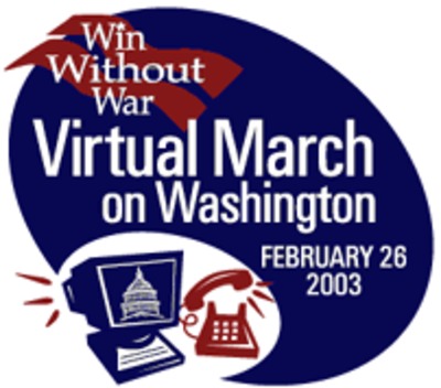 Op dit moment vindt in de VS de Virtuele Mars op Washington plaats - een protestdemonstratie vanuit de huiskamer. De president en alle senatoren worden vandaag bedolven onder een stroom van e-mails, telefoontjes en faxberichten, uit protest tegen de oorlog met Irak. 'On February 26th, you can join a massive march on Washington without leaving your living room. The Virtual March on Washington is a first-of-its-kind campaign from the Win Without War coalition. Working together, we will direct a steady stream of phone calls - about one per minute, all day - to every Senate office in the country, while at the same time delivering a constant stream of e-mails and faxes. Our message: Don't Attack Iraq.' Op de site wordt de boodschappenlawine zichtbaar gemaakt (in de 'antiwar room') en is het tv-spotje van acteur Martin Sheen te zien.