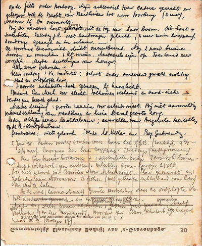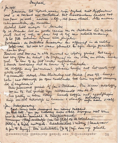 Oude-jaarsavond gevierd bij fam. v. Overbeeke. Om 12 uur ontploffing van een V2. Veel geschiet tegen middernacht van D. Zeer gezellig en sobere viering. Zwarte koffie met appelflapjes eenige voor-oorl. biskwietjes en daarna 1 slaatje. Verlichting mijn accu 2 volts. 1 Jan. Nieuwjaarsdag. (1945) Goed - zonnig weer, smorgens een weinig vriezend. Geen electr. licht - geen gas. Verlichting accu 2 volt. Smorgens met Wim naar de oudelui gewandeld ter nieuwjaarwensch. Hedenmorgen 1 blikje sardientjes (van het GEB) op de boterham. Witlof en laatste aardappels. Suikerbietenkoek 's middags (bezoek van de fam v/d Leyweg). Deze suikerbieten (70 kg) zijn door mij gehaald op de fiets onder Boskoop. Mijn achterwiel toen caduc geraakt en geloopen met de vracht van Benthuizen tot aan Voorburg (3 uur), waarna bij Do overnacht. Bij Do eveneens hout gekapt uit de top van haar boom. Dit hout + suikerbieten zaterdag j.l. met handwagen gehaald, 3 uur ruim loopend. smiddags gezaagd en in schuur. De voorraad levensmidd. slinkt onrustbarend. Nog 2 pond bruine boonen en misschien 1 kg maïs. Aardappels zijn op. Toestand zeer zorgelijk. Magda duizelingen van honger. Allen zwaar verkouden. Heden-middag 1 V2 mislukt; schoot onder donderend geweld richting stad en ontplofte daar. S'avonds suikerbieten-koek gebakken bij kaarslicht. Toestand Lien Merk. zeer slecht. Volkomen verlamd en dood-ziek. Verder geen bezoek gehad. Nieuwe dreiging: groote razzia voor arbeidsinzet. Bij niet aanmelding verbeurd-verklaring van meubilair en huis. Overal groote zorg. Heden ettelijke keren luchtalarm; aanvallen van Engelsche toestellen op de V2-startplaatsen. Frontnieuws: niets gehoord. Toespr. Ad. Hitler en Prof. Gerbrandy. 2 Jan '45. Heden mistig somber weer. Naar het GEB (werktijd 9 3/4 - 3 1/4 uur). 'S morgens een bord roggepap. 's middags (medegenomen) een pan bruine-boonensoep + 1 suikerbietenkoekje. 'S avonds br. boonen- soep + witte kool (geen aardapp.) Verlichting accu-lampje 2 volt. Nog niets gehoord van Ausweis voor Arbeidsinzet. Plan gemaakt a.s. zaterdag naar Wormerveer te fietsen (met geleende achterband van Noor) om eten te halen. In de stad (Laurierstraat) groote verwoesting door de ontplofte V2. Vele dooden en gewonden en enorme glasschade. Magda nog steeds zwaar verkouden. Wim goed gezond, ikzelf verkouden (en zeer vermagerd). Boorden van Mevr. Klinkenberg gekregen maat 15 3/4 (vroeger 17). De stad biedt een triest beeld. Bijna alle boomen omgezaagd en gekapt. Heden 9 uur naar bed. frontnieuws: hevige gevechten in België. Russen in Buda-pest. Nieuwjaarsrede i/d courant van Ad. Hitler en Goebbels. (N.B. De V2-raketstartplaatsen bevonden zich op een kilometer afstand, het Duitse afweergeschut stond pal achter ons huis opgesteld.)