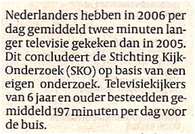 - Maar dat betekent dat men in de meertijd die men aan de media besteedt, zich minder met andere zaken kan bezighouden ' Klopt. Bij het lezen van die ogenschijnlijk elkaar tegensprekende cijfers moet men andere onderzoeken meewegen. Zo heb ik gevonden dat de Nederlander in 2006 gemiddeld zeventien minuten korter aan tafel zit om te eten, vier minuten korter doucht of in bad ligt, negen minuten korter op het toilet zit, drie minuten minder tijd besteedt aan het voorspel en acht minuten minder aan geslachtsgemeenschap, tien minuten korter slaapt en elf minuten minder kranten leest. En telt u die cijfers nu eens bij elkaar op.'