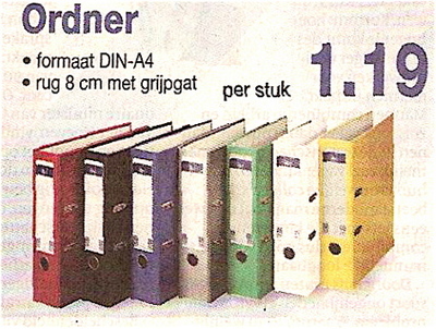 Het loont de moeite ook de advertenties in de kranten tot in detail te bestuderen. Zo kwam ik er vanmorgen achter wat het nut is van het ronde gaatje in een klassieke kantoorordner. Ik gebruik al jaren geen ordners meer om orde in de papierchaos te scheppen, maar ik kan me niet herinneren dat ik ooit een ordner uit een rij ordners heb gelicht, door mijn vinger in het gaatje van de gezochte ordner te steken. Als men mij in een quiz de vraag had gesteld: ' Waarom zit in ordners een rond gaatje in de rug en waartoe dient het en wat is de naam?' zou ik het antwoord schuldig blijven. Nu weet ik het. Grijpgat. Wat een helder en functioneel woord - vorm en functie worden er perfect in uitgedrukt. We hebben weer wat bijgeleerd, onze kennis van de wereld is vergroot en dat is een goed gevoel om de dag mee te beginnen.