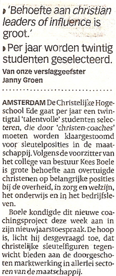 De kop van het artikel in de Volkskrant luidt: 'Hogeschool Ede stoomt 'superchristenen' klaar.' En de voorzitter van het college van bestuur benadrukt dat de behoefte aan 'christian leaders of influence' groot is. Vraag 1: Is de behoefte aan christelijk leiderschap wetenschappelijk meetbaar? Vraag 2: Zal de nieuwe, overwegend protestants-christelijke regering bevorderen dat christian leaders of influence op sleutelposities bij de overheid worden benoemd? Vraag 3: Kunnen christelijke leidinggevenden in de toekomst uiterlijke kenmerken krijgen? Te denken valt aan speciale kostuums (gewaden), of hoofddeksels. Op die manier wordt aan niet-christelijke ondergeschikten de kans geboden zelf te bepalen of zij willen werken onder leiding van zich superieur voelende superieuren. Vraag 4: Kunnen vrouwen met kinderen en praktiserende homo's ook leaders of influence worden?