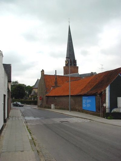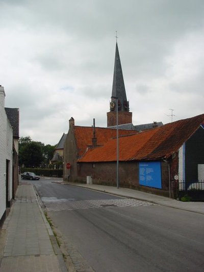 Een Vlaamse straat in een Vlaams dorp. Daar rechts, wat is dat voor een blauw Vlaams bord, tegen die Vlaamse muur?
