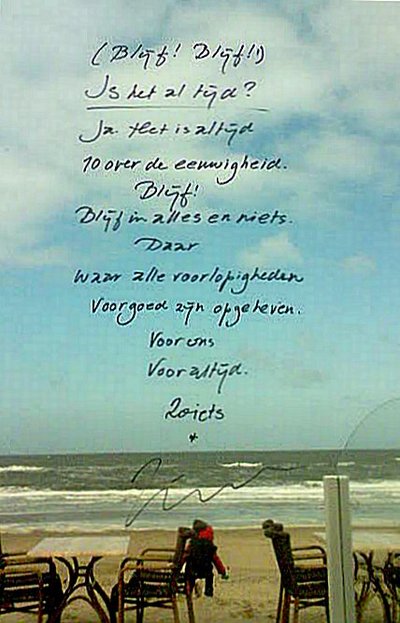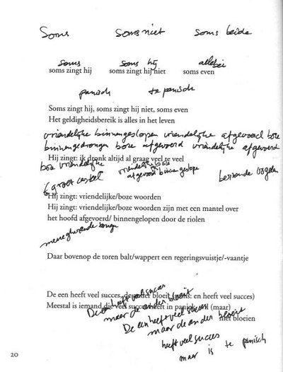 Een pagina uit 'Wij zagen ons in een kleine groep mensen veranderen', de nieuwe bundel van Tonnus Oosterhoff, uitgegeven door De Bezige Bij. De handgeschreven toevoegingen zijn weliswaar gedrukt, maar het lijkt of de dichter geen afstand van het gedicht kon doen. Alsof hij, toen de bundel gedrukt en wel klaar lag voor verzending naar de boekhandel, wilde aangeven dat enkele gedichten niet af waren; dat er andere mogelijkheden zijn geweest, of in het verschiet liggen. Ook de twaalf gedichten op de meegeleverde CD-ROM zijn voortdurend in beweging. Regels verschijnen en verdwijnen, soms staat een kant-en-klaar gedicht op het scherm, dat niet voltooid blijkt, want woorden en regels worden vervangen door andere. Het procédé is te bekijken op de site van Oosterhoff. Je kunt je er per e-mail abonneren op nieuwe gedichten. Ik ben geen poëziecriticus en ik heb de bundel te kort in huis om iets zinnigs over de inhoud te zeggen. Wel weet ik zeker, dat ik met bundel en site lang bezig zal zijn. Ik ken geen andere dichter die op zo'n fascinerende manier gebruik maakt van de 'nieuwe media'.