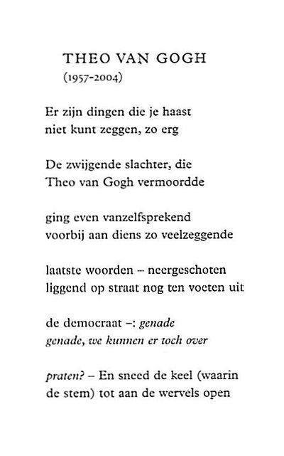 Gisteren werd in Bergen de nieuwe poëziebundel van Elly de Waard ten doop gehouden in De Eerste Bergensche Boekhandel. Opmerkelijk zijn de gedichten die zij heeft geschreven naar aanleiding van de moorden op Pim Fortuyn en Theo van Gogh. In het lange gedicht 'De Ballade van de vermoorde politicus' wordt de naam Fortuyn niet genoemd, maar in de eerste strofe wordt al meteen duidelijk over wie het gaat: Zes uur, zes uur heeft geslagen het nieuws gaat over het land met lichte stap komt naar buiten een man - hij zakt naar de grond In 'Theo van Gogh' vormen diens laatste woorden de kern van het gedicht. Bij de presentatie van de bundel lichtte Elly de Waard toe waarom deze actuele gedichten niet moeten worden opgevat als politieke statements. Een fragment uit haar verklaring is hieronder te beluisteren. De bundel bevat ook gedichten van een andere orde. In de afdeling Thuisland speelt Nederland en het leven en de woonomgeving van Elly de Waard een grote rol. Speciaal voor Bieslog leest zij de gedichten 'Theo van Gogh' en 'Oorsprong'.