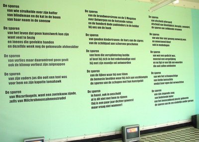 Door de hoge ramen van het schoollokaal valt het zonlicht met bakken naar binnen. Hoeveel kinderen hebben verlangend naar buiten zitten staren? De school wordt binnenkort afgebroken. Het zonlicht tekent voor het laatst haar sporen op de vloer. De achterwand is bedekt met het gedicht Sporen van Hugo Claus. Zijn stem klinkt door de lege ruimte van het schoollokaal in Watou. Dichteres en columniste Marjoleine de Vos in NRC-Handelsblad over de voordracht van Sporen door Hugo Claus: 'Ja, zoiets is op papier niet een twee drie weer te geven, maar het komt er op neer dat Claus nóóit naar beneden glijdt, zeer verstaanbaar is, onnadrukkelijk moduleert en waar nodig de woorden en de regels een beetje aan elkaar zingt en dat alles in het schoonste Nederlands dat dankzij het Vlaamse accent net iets ronder en molliger klinkt.'