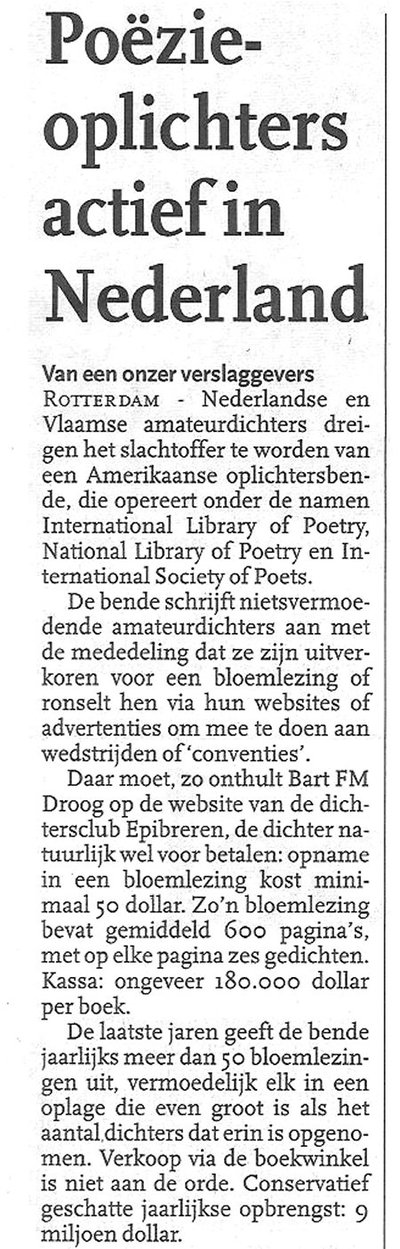 Trektocht O vader, wij zijn samen geweest in de tent op de trektocht rond het IJsselmeer. Overal oreerde de modder maar we ontbeerden de laarzen en sopten tot het eind van de weg. Domweg dapper was je toen de scheerlijnen knapten en de haringen vlogen door de lucht. Het tentdak lekte na aanraking en de primus woei uit. Groot was de verbijstering van dichter Sijmen van Woelgeest toen hij daags na publicatie van bovenstaand gedicht op zijn eigen site, een e-mail in zijn box vond van de International Library of Poetry. 'Gefeliciteerd! U hebt met uw gedicht de hoofdprijs gewonnen in de European Contest van onze Library. De prijswinnaar zal worden opgenomen in de World Anthology of Contestwinners.' Zo luidde, vrij vertaald, de boodschap. Die avond werden grote feesten gevierd in diverse café's, waarbij Sijmen van Woelgeests werkbeurs van het Fonds der Letteren voor de sponsoring zorgde. Dat hem de volgende dag dringend werd gevraagd 50 dollar per creditcard over te maken naar de Library als tegemoetkoming in de drukkosten, vond Sijmen niet meer dan billijk. Hij stuurde zelfs nog vijftien gedichten extra, vergezeld van betaling - de werkbeurs was schoon op - waardoor hij deelnemer was geworden aan de International Poet of the Year Contest in Washington. Nog goedkoop, vond Sijmen, een internationale doorbraak zou jaren sappelen ruimschoots goedmaken. Toen zijn vrienden hem bijgaand artikel lieten lezen, trok hij wit weg, verliet het café met onbekende bestemming en met achterlating van de vliegtickets naar de VS en de kostbare Stetsonhoed die hij zich een uur eerder had aangeschaft. Als hij morgen nog niets van zich heeft laten horen, zullen zijn vrienden de politie waarschuwen.