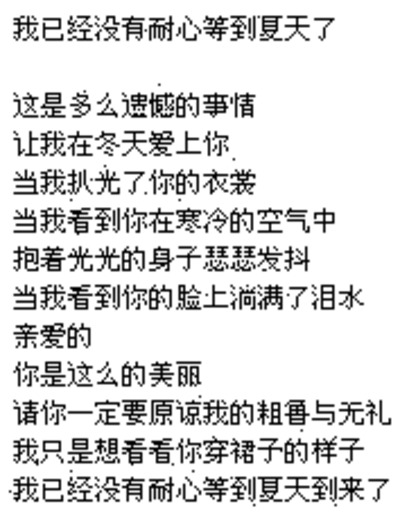 De Engelse vertaling van het Chinese gedicht: I can't wait for summer any longer it's a shame, really making me fall in love with you in winter when I've stripped off your clothes when I see you in the freezing air your arms wrapped around your bare, shivering body when I see your face covered in tears darling you're so beautiful you must forgive my rudeness, my impertinence I only wanted to see what you looked like in a skirt I can't wait for summer any longer Sheng Xing (geb. 1978) - vertaling: Simon Patton Ruim een uur geleden is een schatkamer opengegaan: de eerste internationale poëziewebsite Poetry International Web.