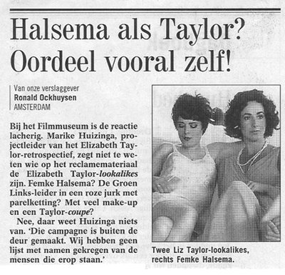 De prangende vraag wordt in de Volkskrant op voor- en kunstpagina vetgedrukt gesteld: Is één van de Elisabeth Taylor-lookalikes op een affiche van het Filmmuseum de GroenLinks-leider Femke Halsema? Halsema zelf ontkent niet. Goed werk van de Volkskrant. Maar de krant laat een vraag liggen. Wie is de Liz Taylor-lookalike naast Femke Halsema? Bieslog waagt een gok. Dominee Jacobine Geel is de Elisabeth Taylor van de Nederlandse televisie. Journalistiek gezien belooft deze zomer zeer interessant te worden.