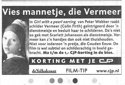 Niet voor iedereen 'n pretje, die beginjaren van de 21-ste eeuw. Ben je tekstschrijver, moet je een film, die 'subtiel en schilderachtig in beeld is gebracht', aan een jong publiek verkopen. Over Vermeer! De deskundigen weten niets van hem - je gaat er vanuit dat jouw jonge, dus domme publiek niet eens zijn naam kent en denkt dat de Gouden Eeuw in 2000 begint. Maar gelukkig, de hoofdrol wordt gespeeld door Scarlett Johansson. Da's niet gek. Hoef je je handjes niet thuis te houden. Kun je met je vieze vingertjes op je vieze toetsenbordje er een vies tekstje uitrammelen, waarin je Vermeer voor vies mannetje uitmaakt.