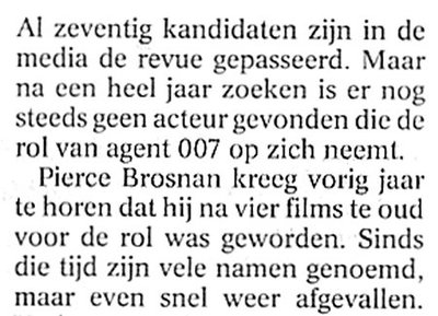 Vorige week kreeg ik het zakelijke briefje, ondertekend door producers Cobby Broccoli en Harry Saltzman: 'Tot onze spijt moeten wij u mededelen, dat u na analyse van de door u afgelegde cameratest niet in aanmerking komt voor de rol van James Bond. Wij achten u op grond van uw leeftijd minder geschikt voor de rol van agent 007.' Ik was kandidaat nummer 67. De eerste Nederlandse James Bond worden - het leek mij een poging waard. Mijn gevorderde leeftijd beschouwde ik als een pluspunt. James Bond zelf is ook aan zijn vierde jeugd toe en het zou goed zijn, meende ik, als die leeftijd in het fysiek van de Bondacteur zichtbaar zou zijn. Het Bondpubliek bestaat immers voor 83% uit grijsaards. Ik was de enige Nederlandse kandidaat. We hebben prachtige jonge acteurs, maar geen van hen 'heeft iets' met de bejaarde filmheld. Hoe achterhaald en belegen ging het toe tijdens de screentest! Men vroeg mij van een met 120 kilometer per uur rijdende vrachtwagen in een langszij flitsende sportwagen te springen. Ik kon mijn oren niet geloven. Voor zo'n ouderwets stuntje ligt de meest simpele digitale techniek in de schappen van de elektronicawinkel op de hoek - met een videobewerkingsprogrammaatje van 150 euro springt iedere boerenlul van auto op auto. Toen ik weigerde om met behulp van een helikopter uit de sportwagen omhoog te worden getrokken - in de jaren zestig deden ze dat misschien nog live, nu is zoiets het digitale fluitje van een eurocent - wist ik dat mijn afwijzing aanstaande was. Wie het ook gaat worden - de acteur die James Bond gaat spelen en voor veel geld de kans loopt zijn benen te breken, is een ongelooflijke sukkel.