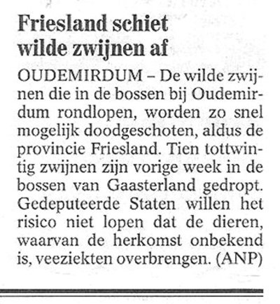 Onbegrijpelijk: mensen die, voordat ze op vakantie gaan, hun zwijnen droppen. En, dat is bekend, eenmaal vrijgelaten worden tamme zwijnen binnen één dag wild. Het probleem blijft niet beperkt tot Friesland. Ik heb de afgelopen weken ook in andere provincies veel loslopende zwijnen gezien. 'Zo snel mogelijk doodschieten' is wel een zeer drastische maatregel. Laten we nu eerst eens proberen de zwijnen op hun wilde gedrag aan te spreken. Het is veel te gemakkelijk zwijnen te stigmatiseren als overbrengers van veeziekten. Daarvoor bestaat vooralsnog geen enkel wetenschappelijk bewijs. We moeten zoeken naar de oorzaken. Waarom zijn de zwijnen in Nederland zo wild geworden? Kunnen we hangplekken voor wilde zwijnen aanleggen? Af en toe een beetje bijvoederen, een praatje maken, luisteren naar hun problemen - ik weet zeker dat wilde zwijnen zich dan een stuk tammer gaan gedragen. Waarna ze terug kunnen keren in de maatschappij. Er zijn mensen die dromen van een zwijnloze samenleving. Dat zij, zoals in Friesland, willen overgaan tot een gewelddadige totstandkoming van deze utopie, is een kwalijke zaak. We mogen 'onze zwijnen' nooit in de steek laten!